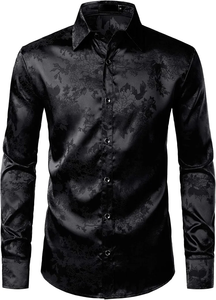 PICKUR MIND Men's Shiny Satin Rose Floral Jacquard Long Sleeve Button Up Dress Shirts For Party Prom